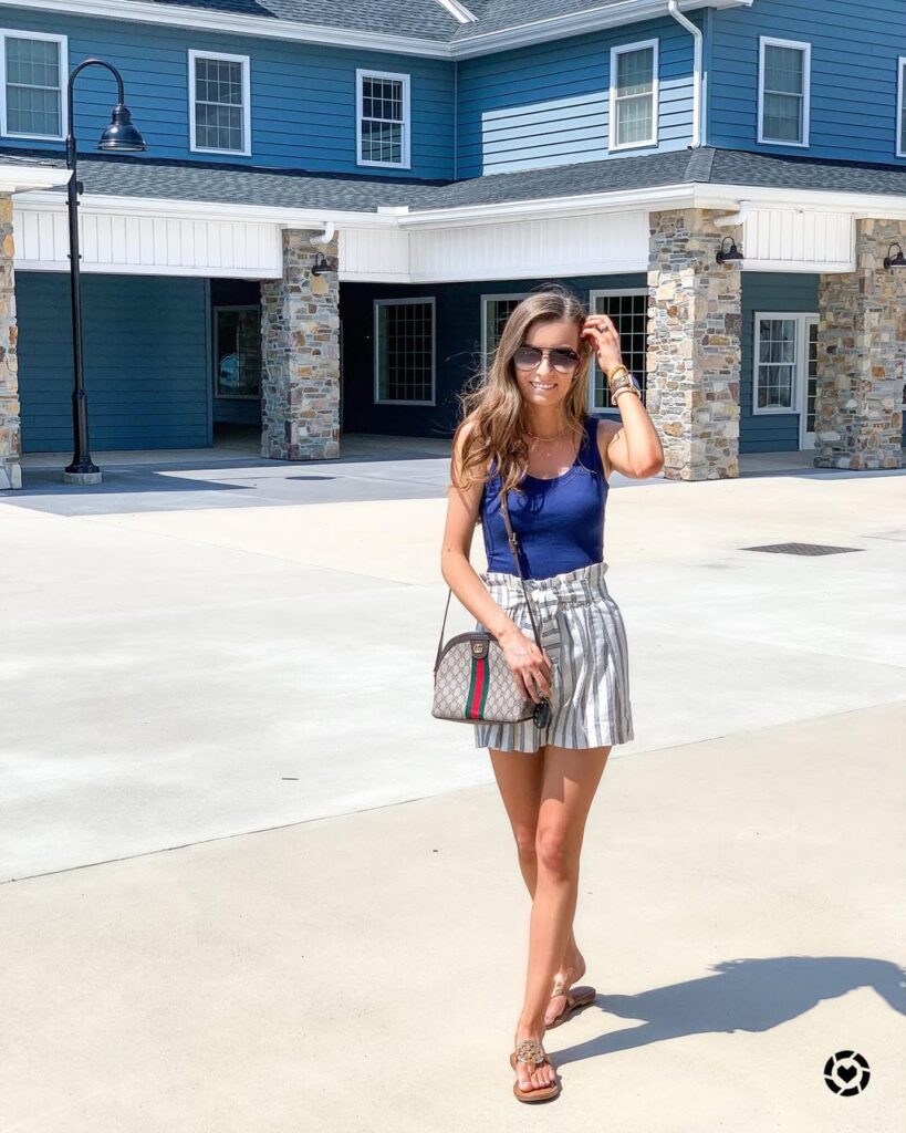 Structured shorts combined with a basic tank top create a polished yet relaxed outfit. This look is ideal for casual city outings or informal gatherings.