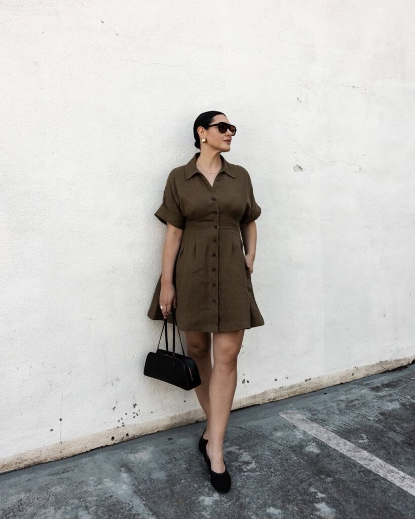 A neutral-toned shirt dress creates a clean and polished appearance. It works well for both casual outings and semi-formal settings. Pairing it with flats or low heels enhances comfort while maintaining elegance.