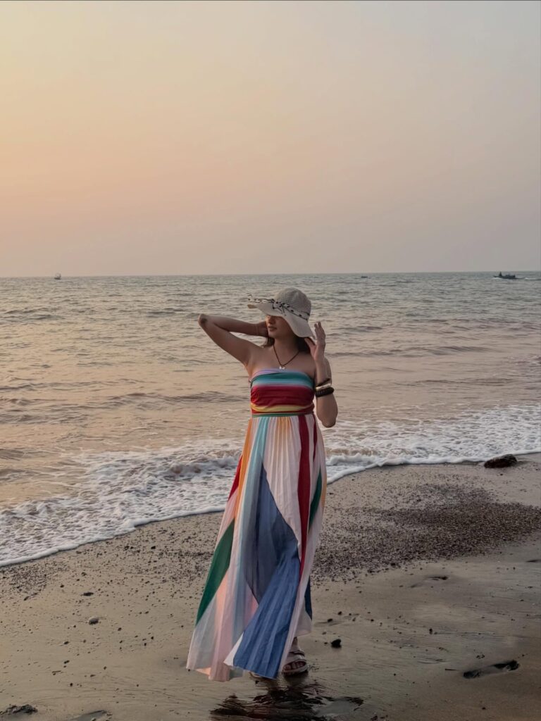 This outfit is perfect for evening beach dinners or romantic walks by the shore. Its simplicity is its strength—no heavy styling needed, just natural light and minimal accessories to complete the look.