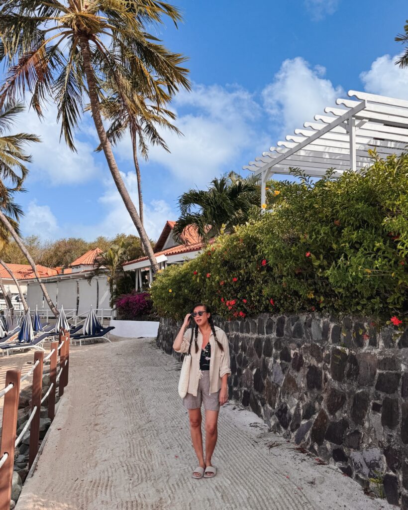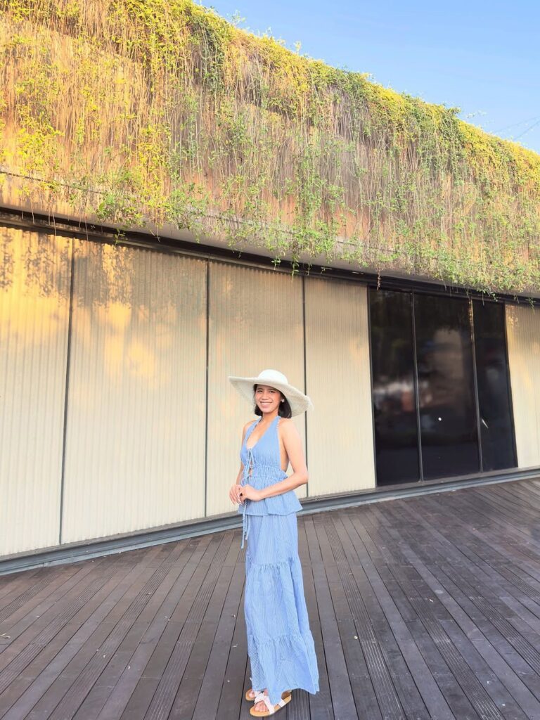 The neutral palette works especially well in tropical settings, blending seamlessly with palm trees, sandy paths, and coastal architecture. This outfit is not about standing out loudly—it’s about looking put-together without trying too hard. Perfect for sightseeing, café hopping, or long walks near the beach.