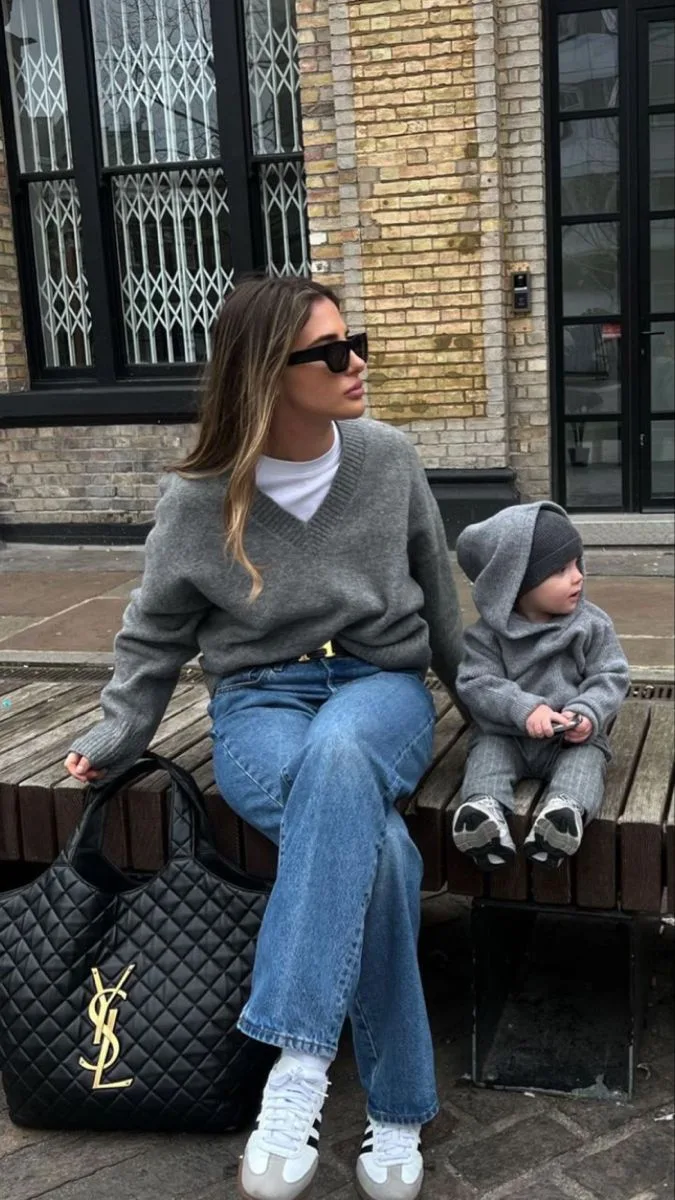 She’s rocking a slouchy grey V‑neck sweater layered over a white tee, paired with straight‑leg blue jeans for that effortless cool‑girl vibe. The look is finished with sporty sneakers, a quilted designer tote, and her mini-me in a matching grey hoodie and pants for the cutest twinning moment.