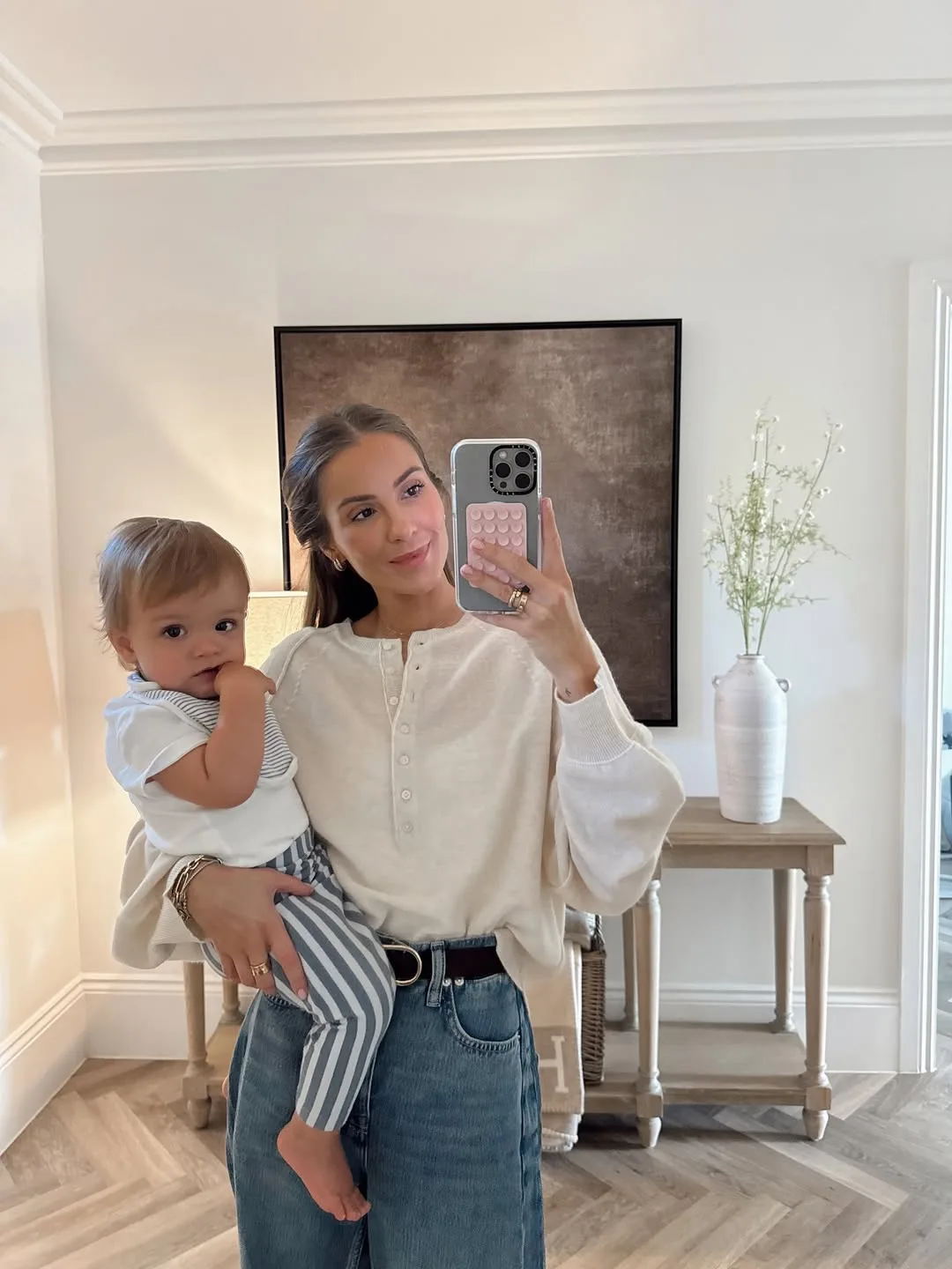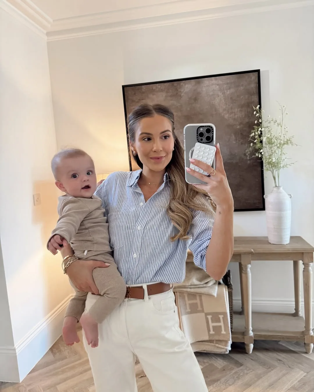 She’s glowing in a breezy blue striped button-up shirt tucked into straight white jeans, selfie-ing with her baby boy in a matching beige knit set. A leather belt, gold bracelet, and cozy throw add that fresh, everyday mommy glow-up.