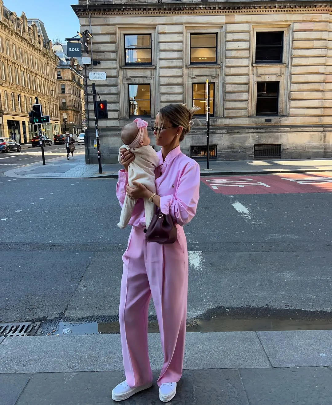 She’s slaying in a flowy hot pink suit—blazer and wide-leg pants—cradling her baby wrapped in white with a matching pink bow. Chunky white sneakers and a mini brown bag give this bold mommy look the perfect playful edge.