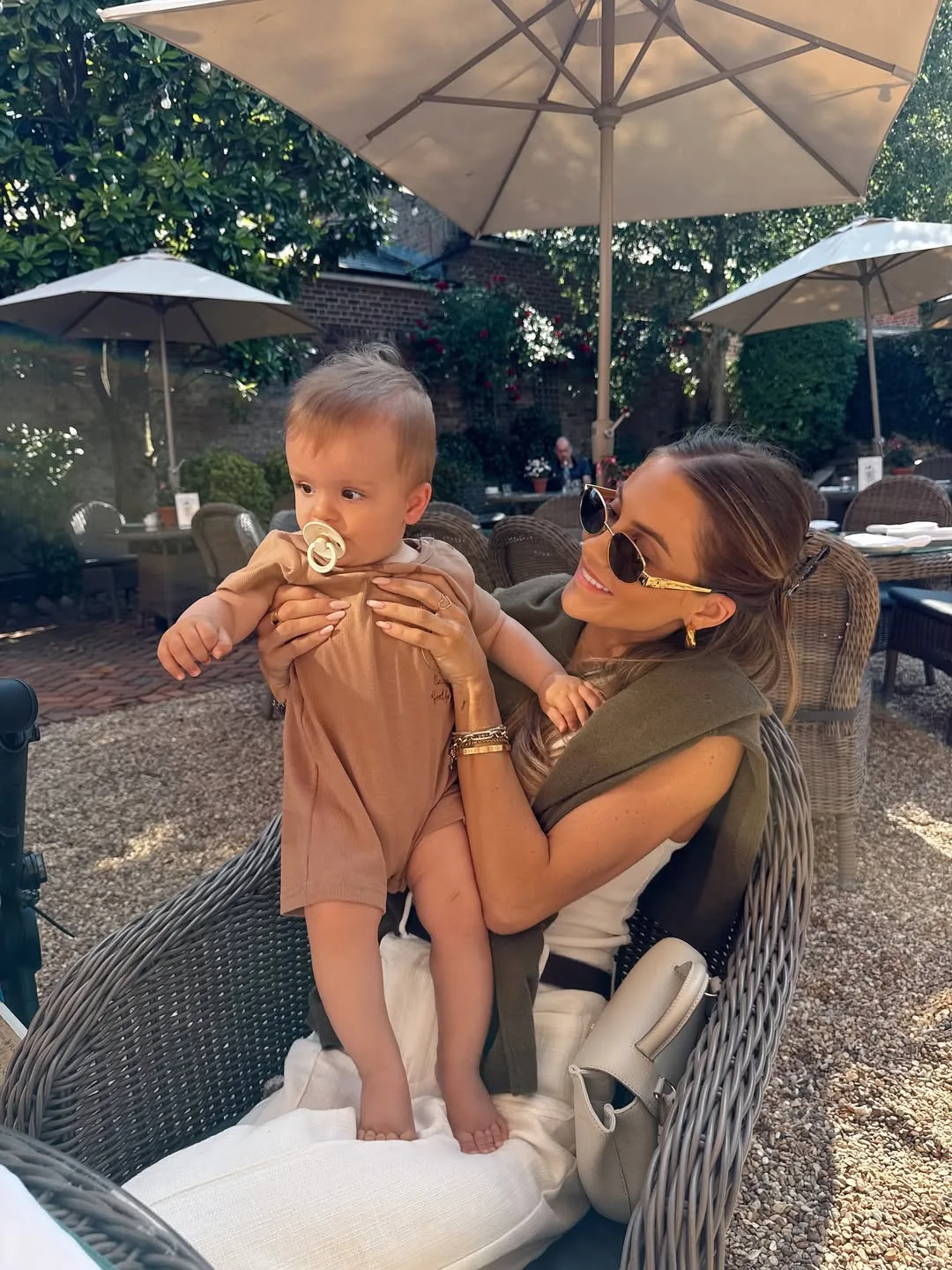 Mom’s in a sleeveless tan linen jumpsuit layered with a white tank, holding her baby boy in a matching tan romper while chilling poolside. Gold jewelry, a white belt bag, and bare feet scream easy summer mommy vibes we’re loving.
