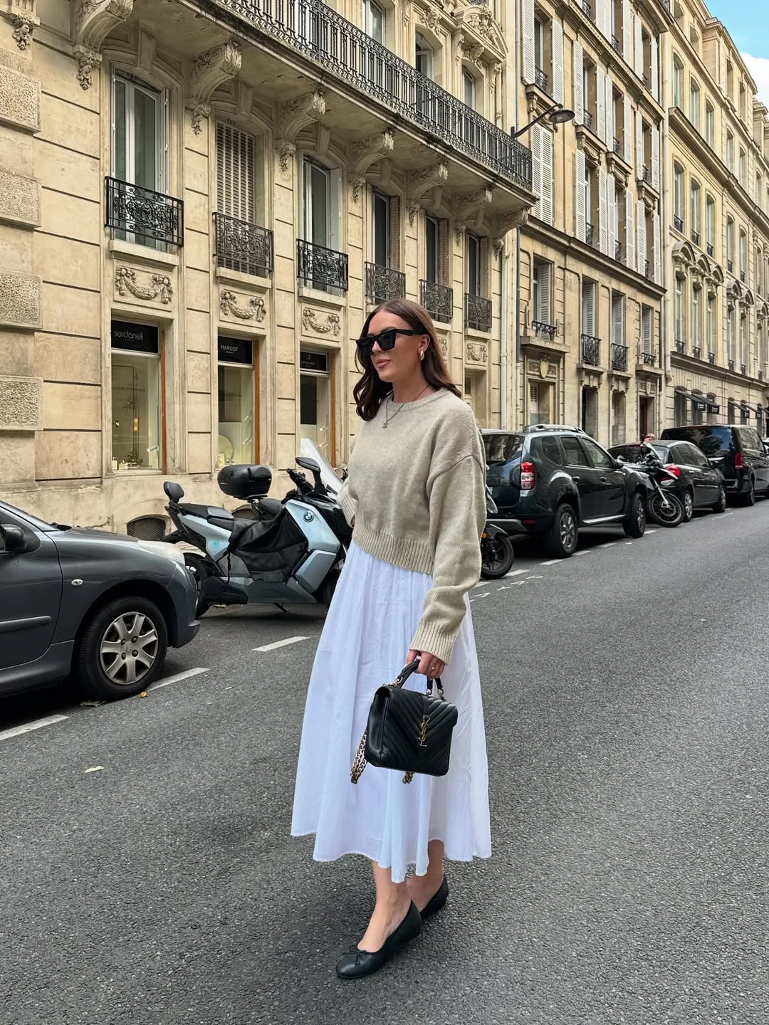 She’s floating in an oversized grey knit sweater over a flowy white midi skirt, strutting with chic black flats and a mini YSL bag. This soft, romantic layering is peak mom style that’s comfy yet totally elevated.