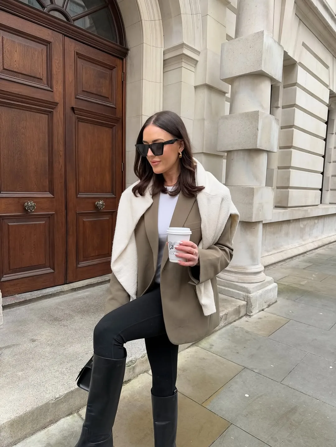 She’s nailing polished street style in a tailored brown blazer over a white tee and sleek black leggings, sipping coffee with fluffy white shoulder draping. Tall black boots and a structured bag elevate this chic, everyday mom uniform perfectly.