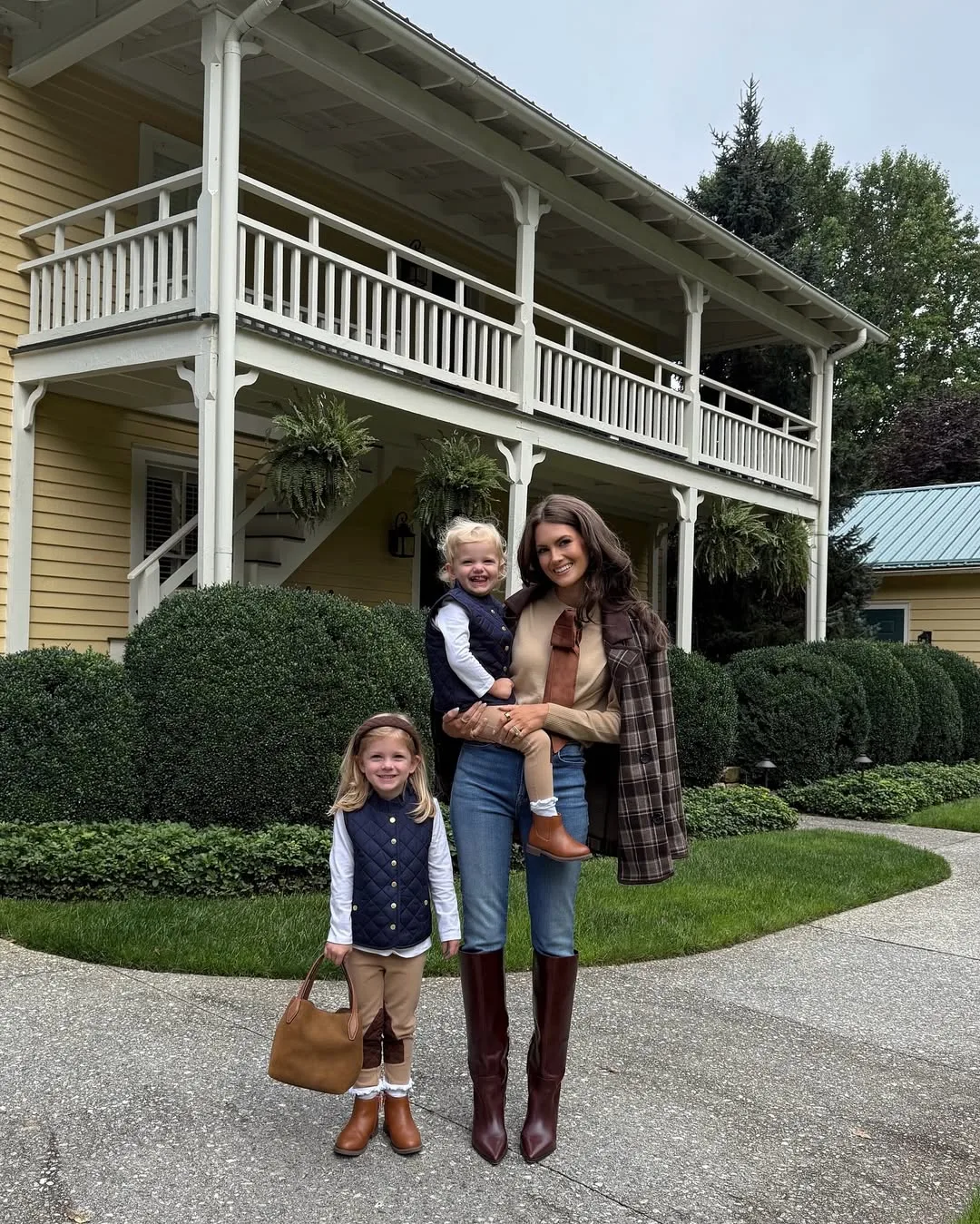She’s family-matching in a long brown checkered coat over a cream top and flared jeans, flanked by her kids in navy outfits with riding boots. Tall brown boots and woven bags bring that cozy, countryside mommy energy we adore.