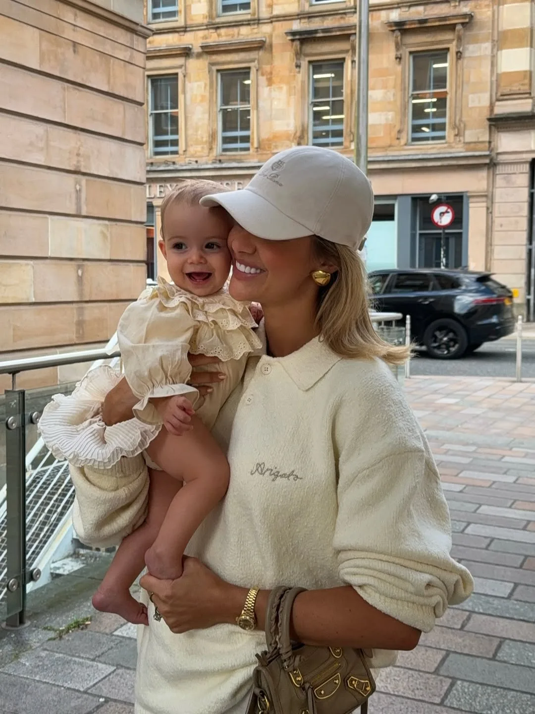 She’s cuddling her baby in an oversized cream cable-knit polo sweater, while her little one rocks a ruffly white dress with matching cap. Layered necklaces, a brown belt bag, and bare feet make this soft, joyful twinning moment pure mommy magic.