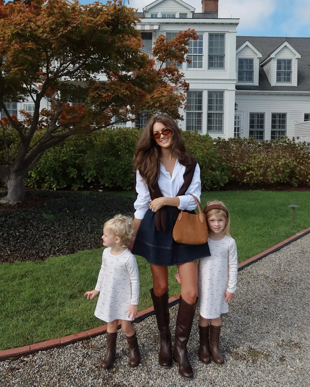She’s fall-perfect in a flowing white button-down shirt tucked into a navy mini skirt, flanked by her daughters in matching white dresses. A red scarf, tan bag, and tall brown boots make this coordinated family look so effortlessly stylish.