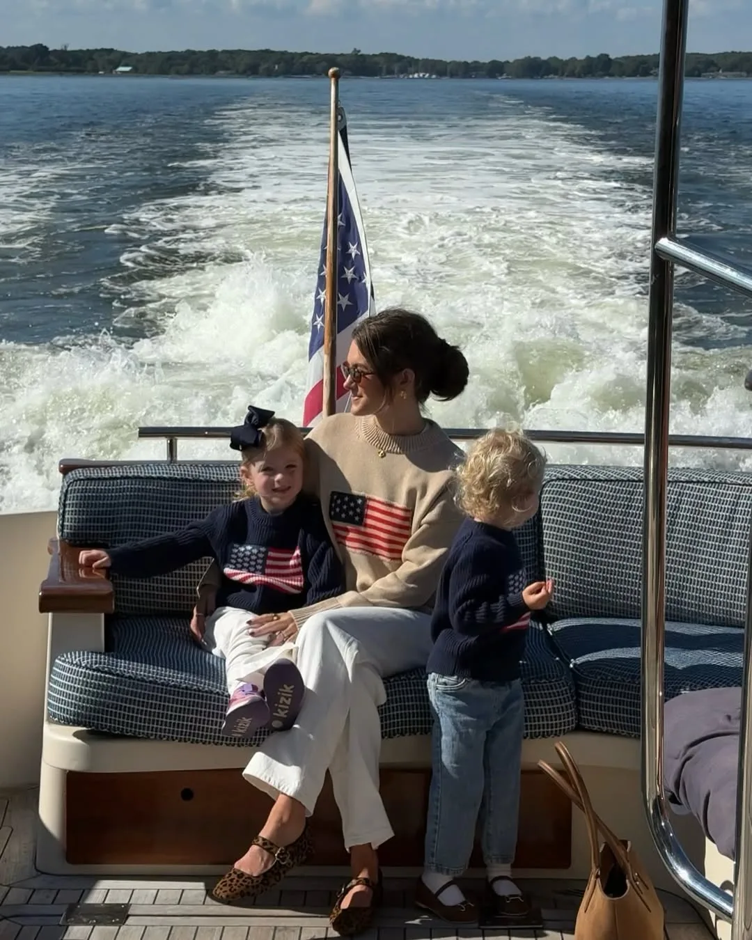 She’s boat-ready in a flag-print cream sweater tucked into white pants, twinning with her kids in matching navy flag sweaters and denim. Bows, loafers, and a tan bag make this preppy family look so fun and festive.