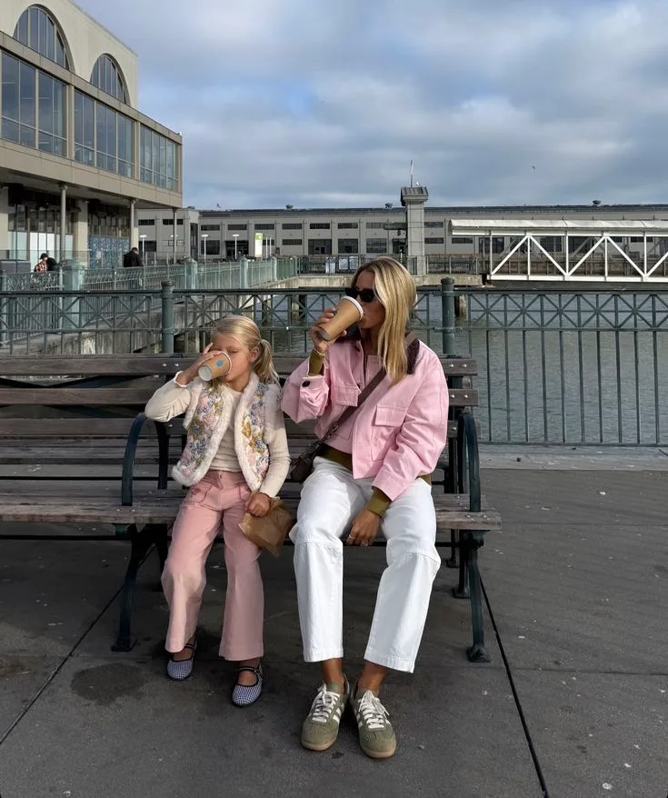Mom’s in a cute cropped pink jacket over an olive sweater, styled with relaxed white jeans for that laid-back but put-together vibe. Her mini is twinning in soft pink pants, a cozy cream knit, and a floral vest, plus sweet little flats and a tiny bag that make the whole look extra adorable.