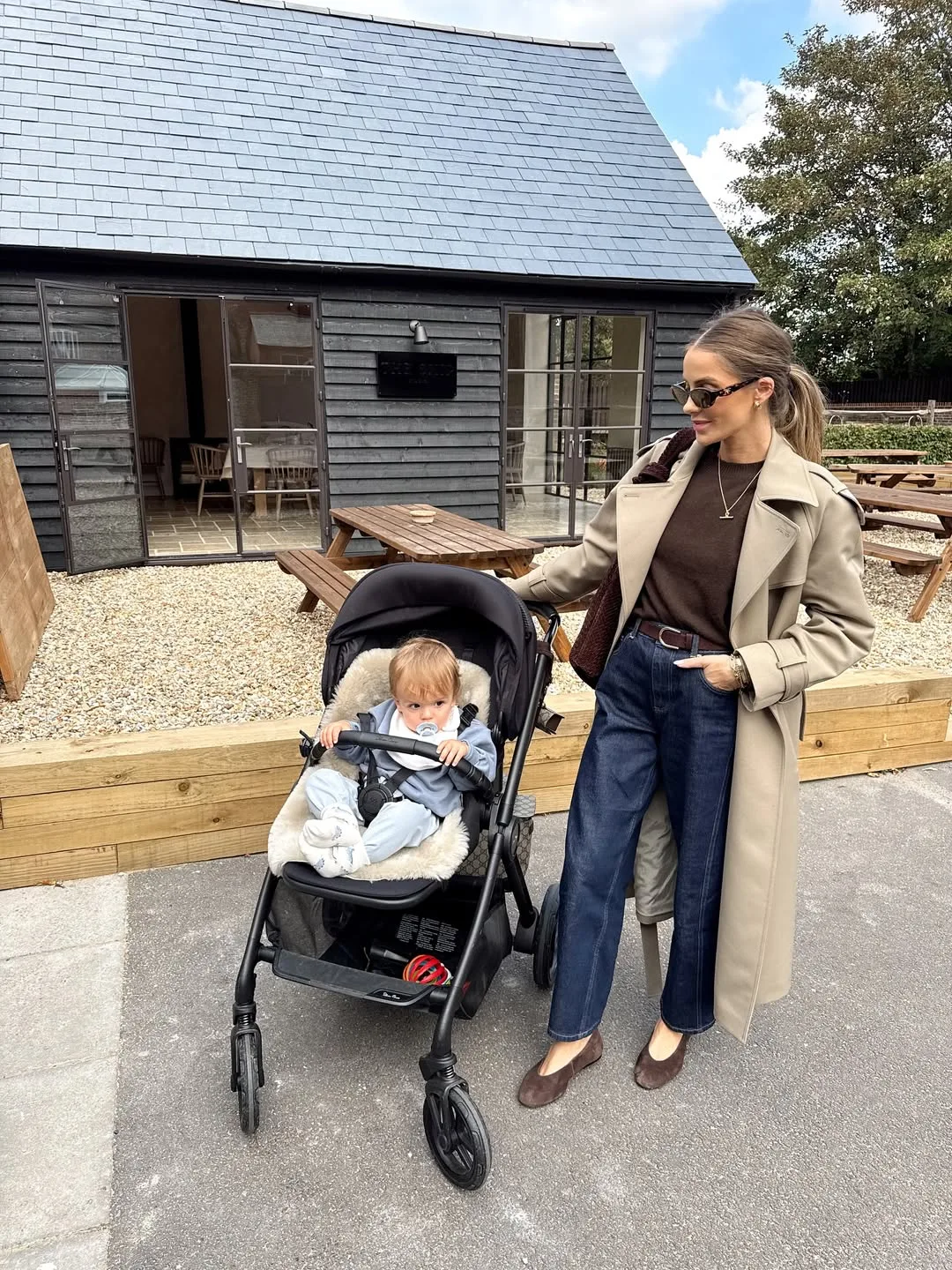 She’s strolling with the stroller in a classic beige trench coat over a brown top and wide-leg blue jeans, alongside her baby in a fuzzy cream sweater. Brown loafers and a gold necklace add polish to this practical, chic mom-on-the-go outfit.