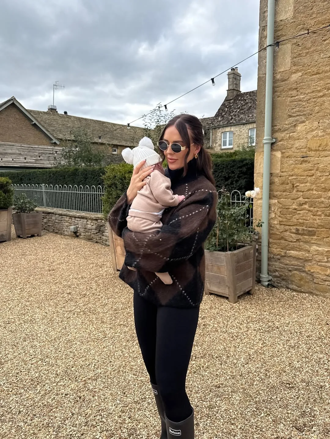 She’s holding her baby in a plush brown checkered jacket over black leggings, ready for cooler days with green wellington boots. This textured, cozy layer pairs perfectly for hands-free mom duties in unpredictable weather.
