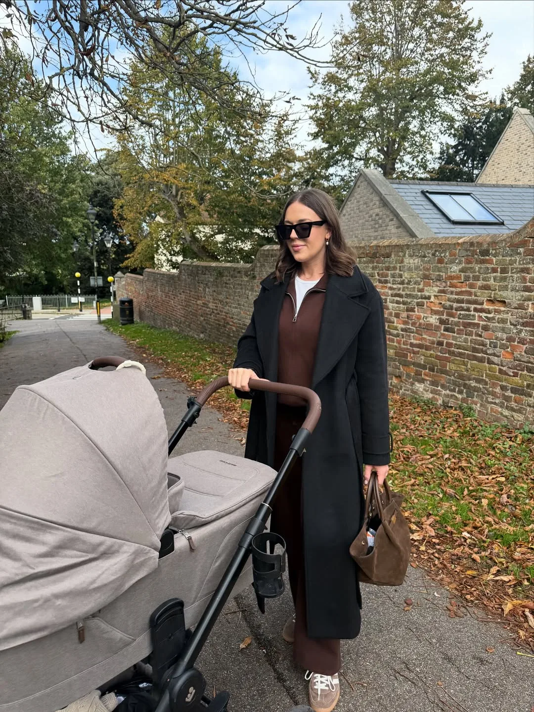She’s pushing the stroller in a long black wool coat over a collared mocha top and wide-leg mocha pants for ultimate fall layering. Chunky cream sneakers and a brown leather bag keep this sophisticated mom look comfy and current.