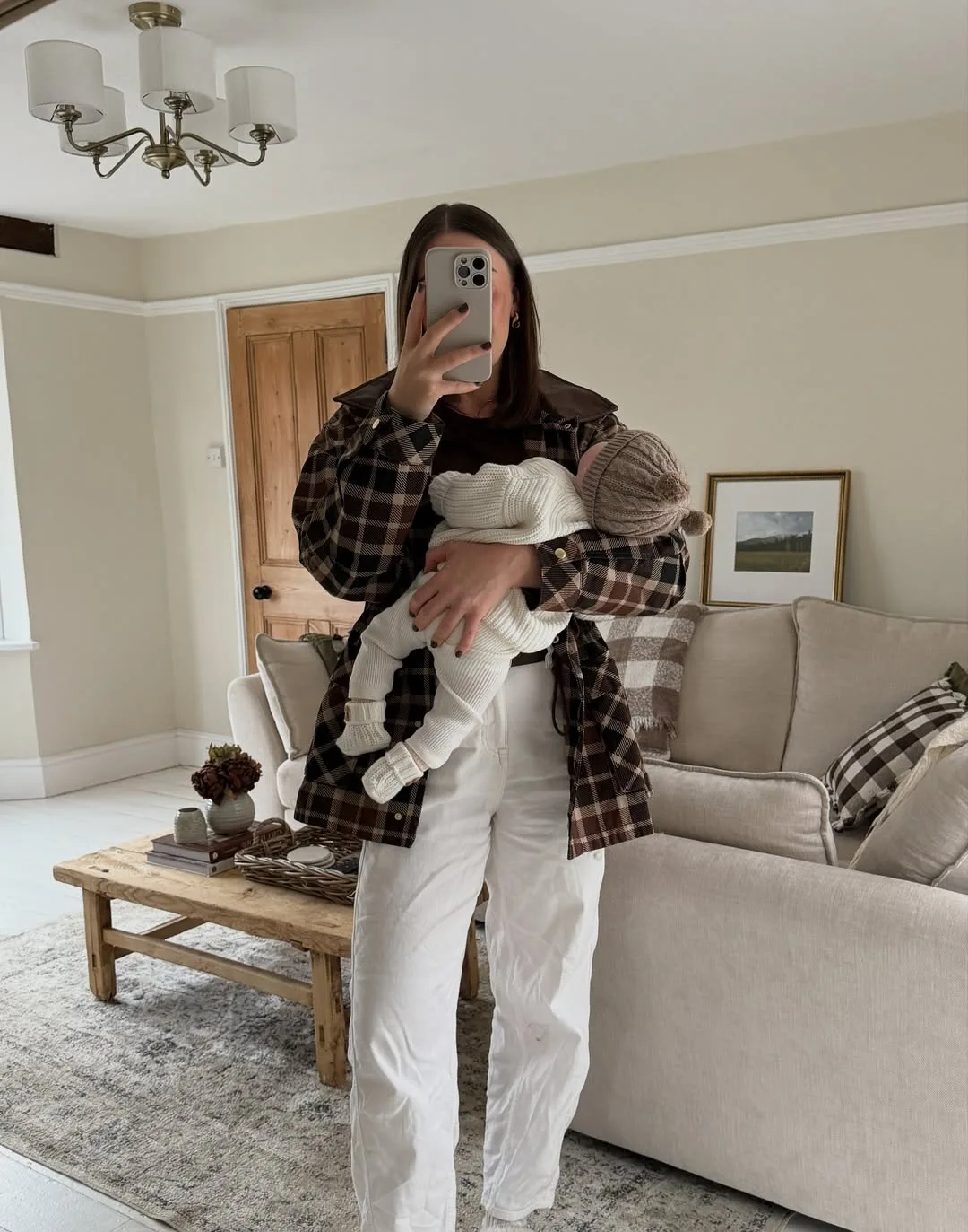 She’s snapping a mirror selfie in a cozy brown-and-black plaid shacket over white wide-leg jeans, cradling her baby in a cream hat and swaddle. This laid-back, textured layer is ideal for transitional weather mom life.