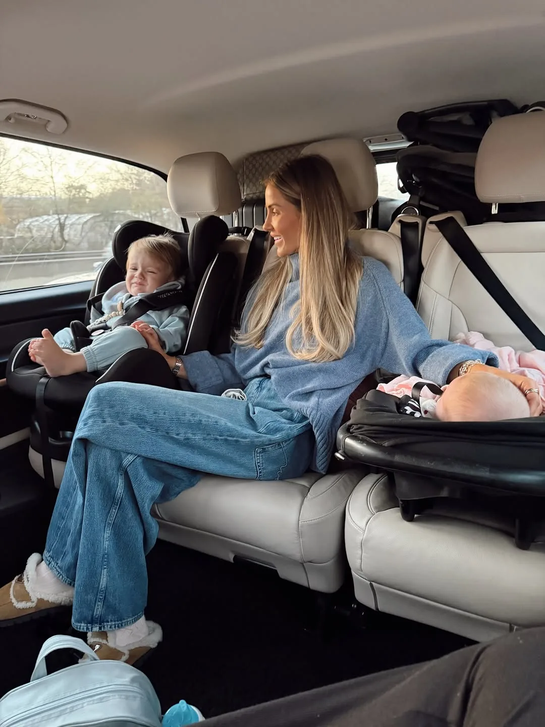 She’s car-seat juggling in an oversized blue knit sweater with relaxed baggy jeans, her toddler strapped in and baby on lap. Fluffy white slippers add that effortless, on-the-go mom coziness we all need.