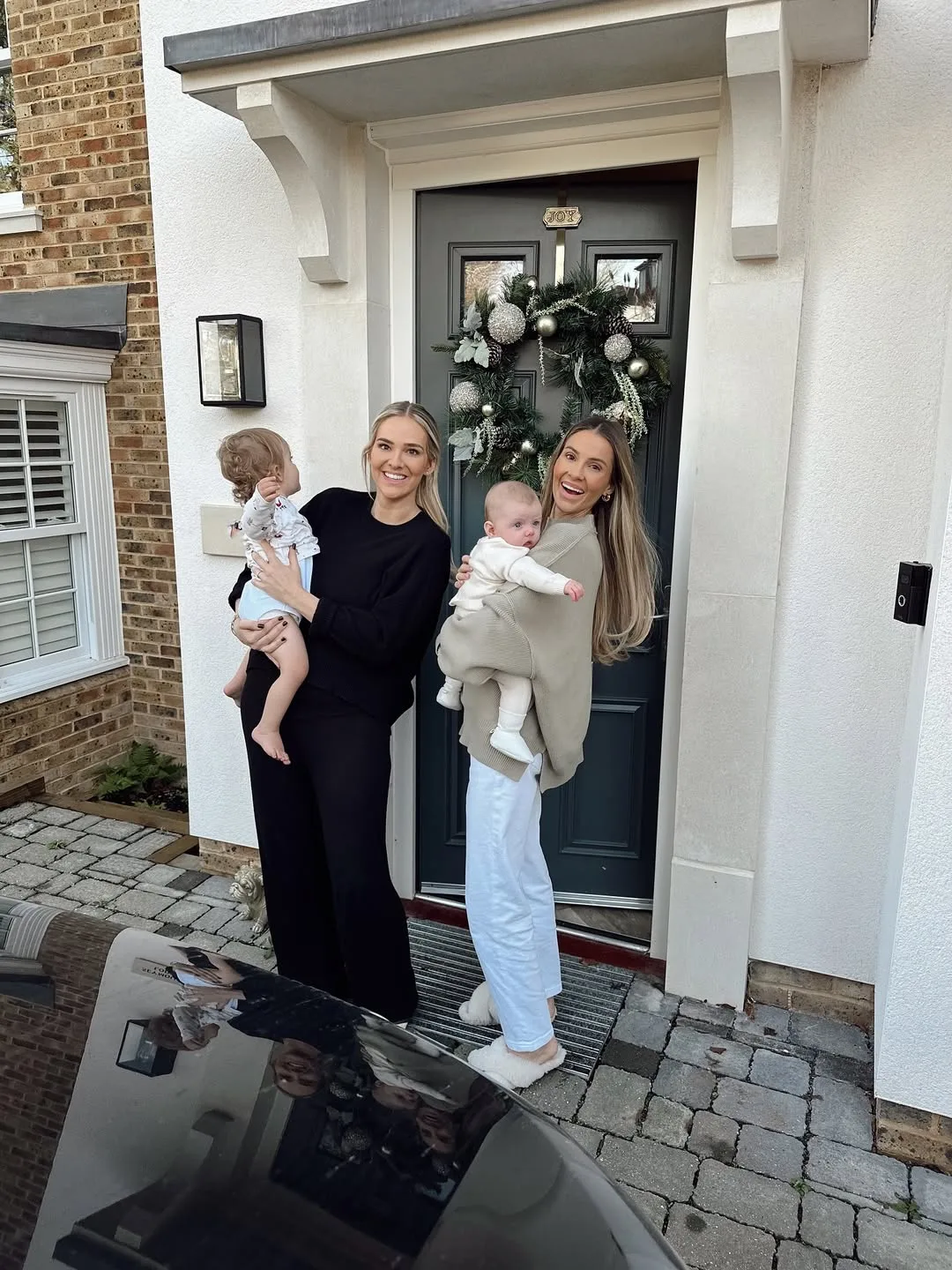 Two moms are twinning holiday-style at the door—one in a black sweater with black wide-leg pants holding a toddler, the other in a cream sweater with cream pants cradling a baby. Fluffy slippers and wreaths set the festive, cozy family vibe.