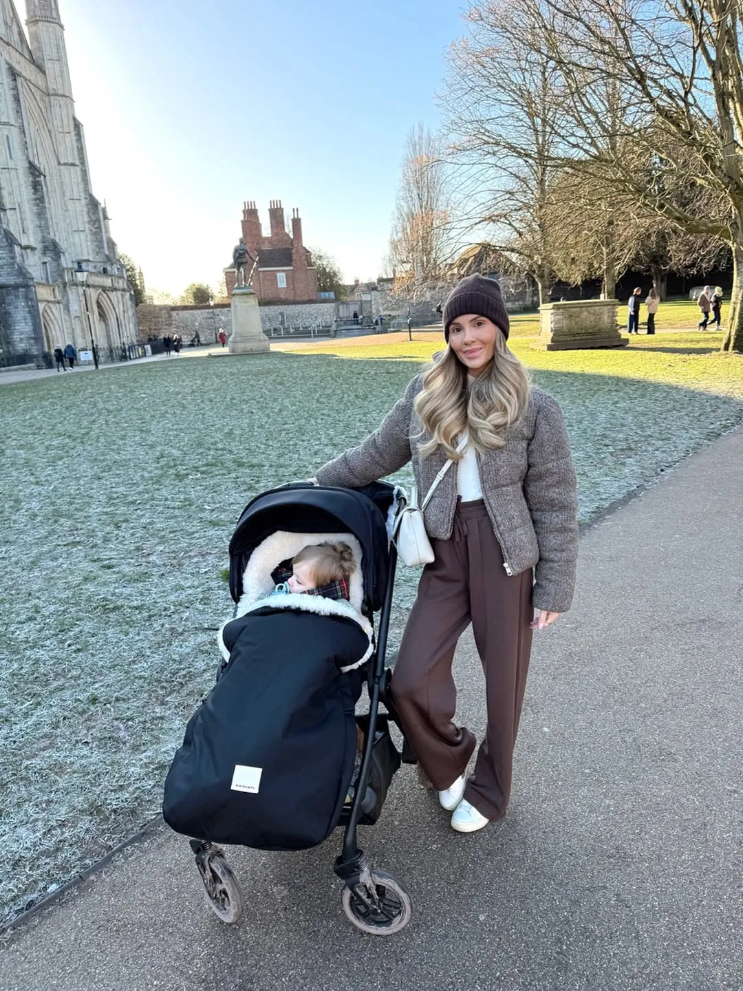She’s strolling the stroller in a chic brown tweed blazer over a white top with wide-leg brown pants, beanie keeping it casual. White sneakers and a small shoulder bag make this polished walk perfect for crisp days.