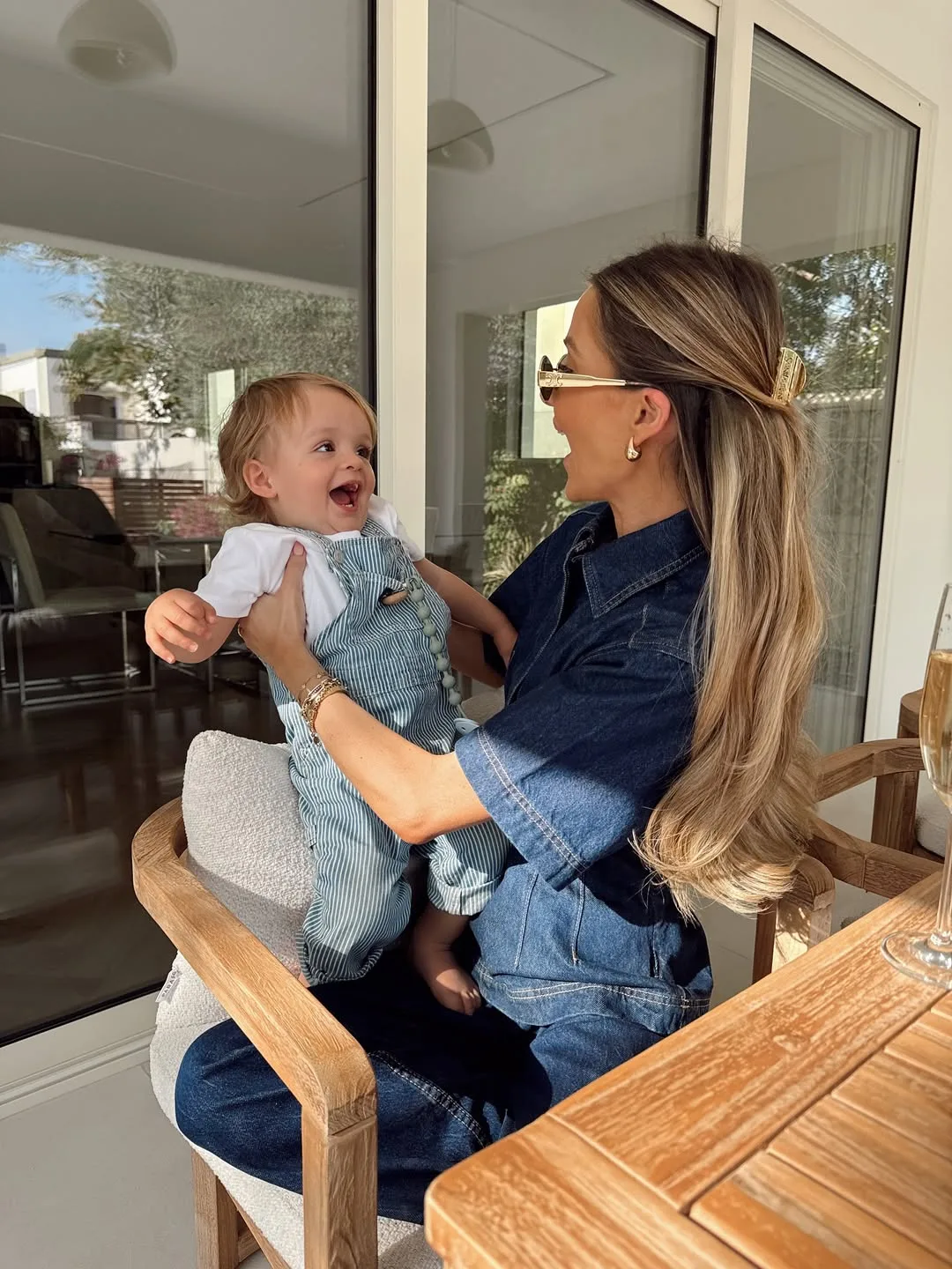 She’s patio-cuddling her toddler in matching denim overalls over a white tee, both beaming with joy. Bare feet and gold hoops keep this summery, fun twinning outfit light and loving.
