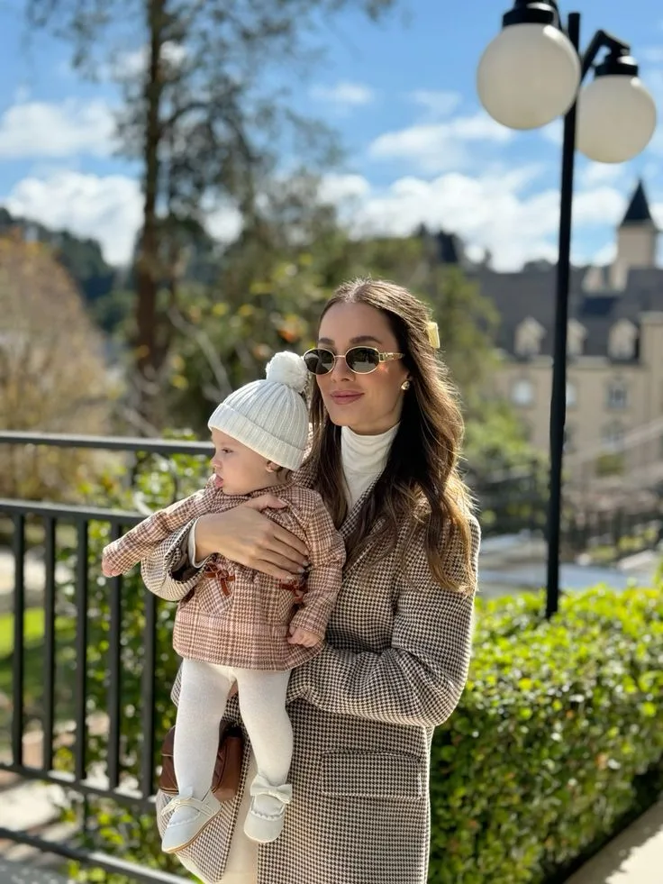 She’s bundled in a tailored camel checkered coat with a crisp white turtleneck underneath, hugging her baby dressed in a matching mini checkered onesie and white leggings. Comfy white sneakers and knit beanies on both add that sweet, coordinated mommy-and-me charm you’ll wanna steal.