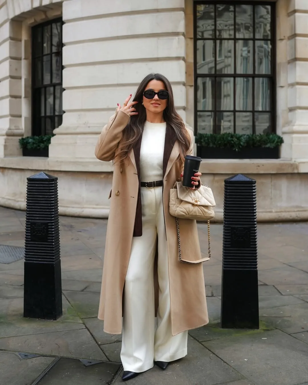 She’s striking a pose in a long camel coat over a white turtleneck and cream wide-leg jumpsuit, tumbler in hand. Pointy black boots and a fluffy cream bag amp up this luxe, minimalist mom silhouette.