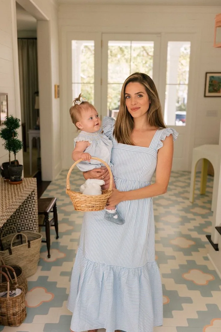 She’s twinning perfectly with her baby girl in matching ruffled blue gingham dresses—hers a flowy spaghetti-strap midi with puffed sleeves, baby’s a tiny version with frills. Wicker baskets and soft ballet flats add that fresh, summery mommy-daughter vibe we’re all crushing on.