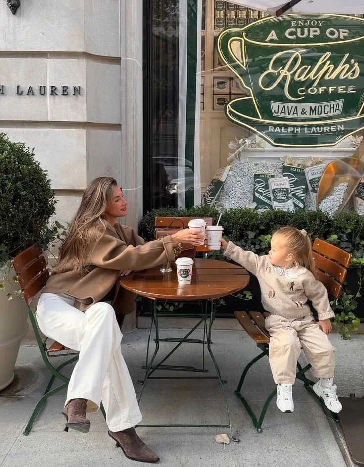 She’s channeling fall coziness in an oversized beige sweater with wide-leg white jeans, toasting coffee with her little one in a matching cream tracksuit. Boots and sneakers keep it casual while their sweet moment screams ultimate mom inspo.