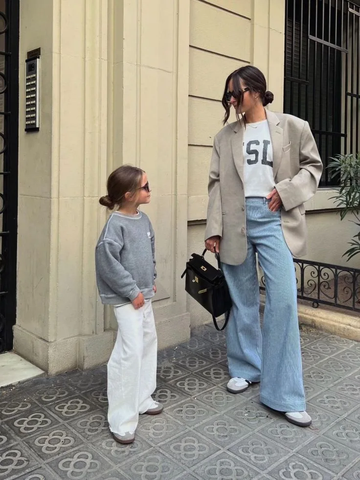Mom’s owning that power casual look in a slouchy beige blazer over a white tee and baggy blue jeans, chatting with her girl in a grey sweater and white pants. Sneakers and a sleek black bag keep it effortlessly cool for the perfect twinning stroll.
