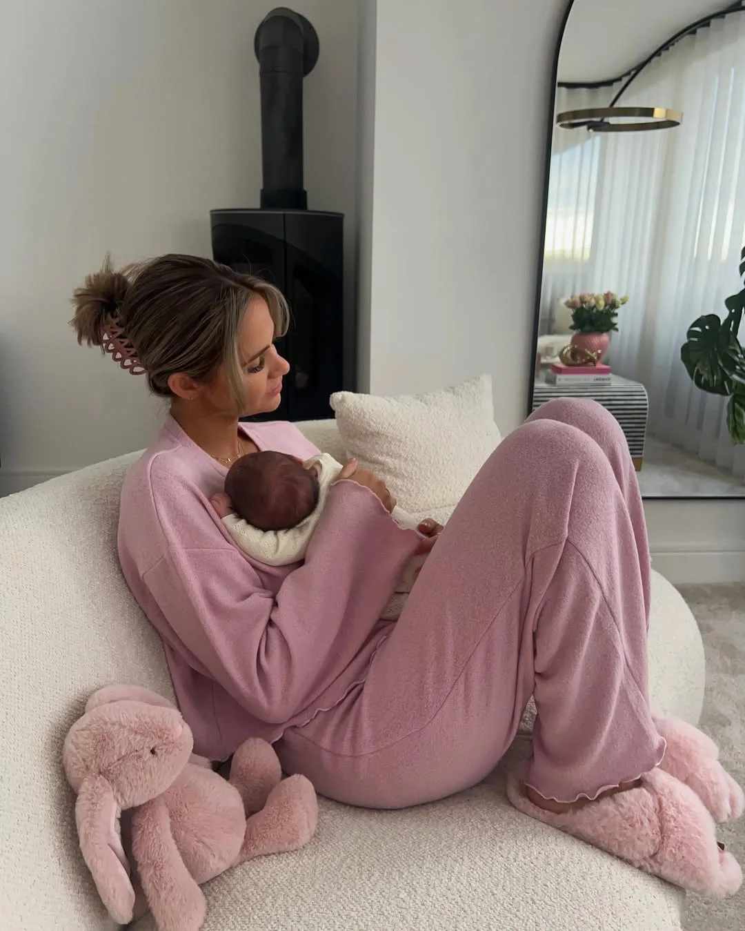 She’s lounging in a super soft oversized pink hoodie and matching pants, cradling her newborn in a white swaddle on the fluffy cream sofa. Fluffy pink slippers and cuddly bunnies complete this cozy new-mom vibe that’s all about comfort and cuteness.