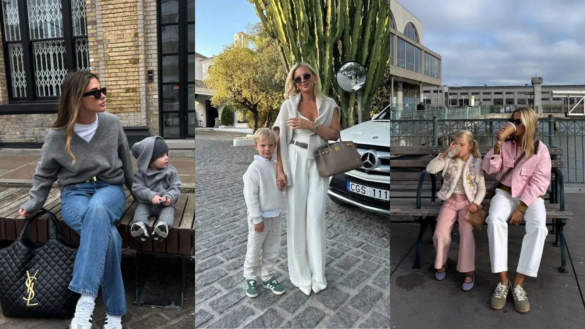 She’s channeling fall coziness in an oversized beige sweater with wide-leg white jeans, toasting coffee with her little one in a matching cream tracksuit. Boots and sneakers keep it casual while their sweet moment screams ultimate mom inspo.