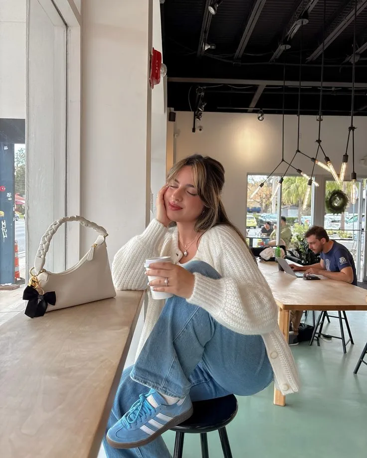 A chunky cream cardigan layered over a simple top creates a soft and comfortable spring look. Paired with relaxed blue jeans and retro-style sneakers, the outfit feels effortlessly casual yet put-together. Finished with a structured shoulder bag and delicate jewelry, it’s a perfect cozy option for an Easter coffee run or a laid-back family gathering.