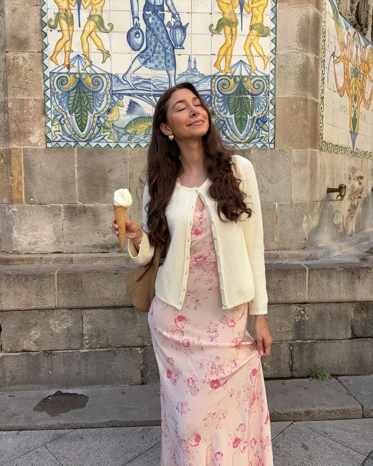 A soft blush satin dress adorned with delicate pink florals creates a romantic and graceful Easter look. The fluid silhouette adds elegance, while the subtle print keeps it fresh and spring-ready. Layered with a lightweight cream cardigan and paired with a woven shoulder bag, the outfit feels effortlessly feminine—perfect for a sunny afternoon celebration or a sweet post-brunch stroll with gelato in hand.