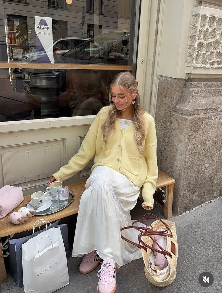 A soft pastel yellow cardigan layered over a simple white top creates a cozy yet fresh spring look. Paired with a flowing white maxi skirt and blush-toned sneakers, the outfit feels relaxed, feminine, and effortlessly charming—perfect for a casual Easter brunch.