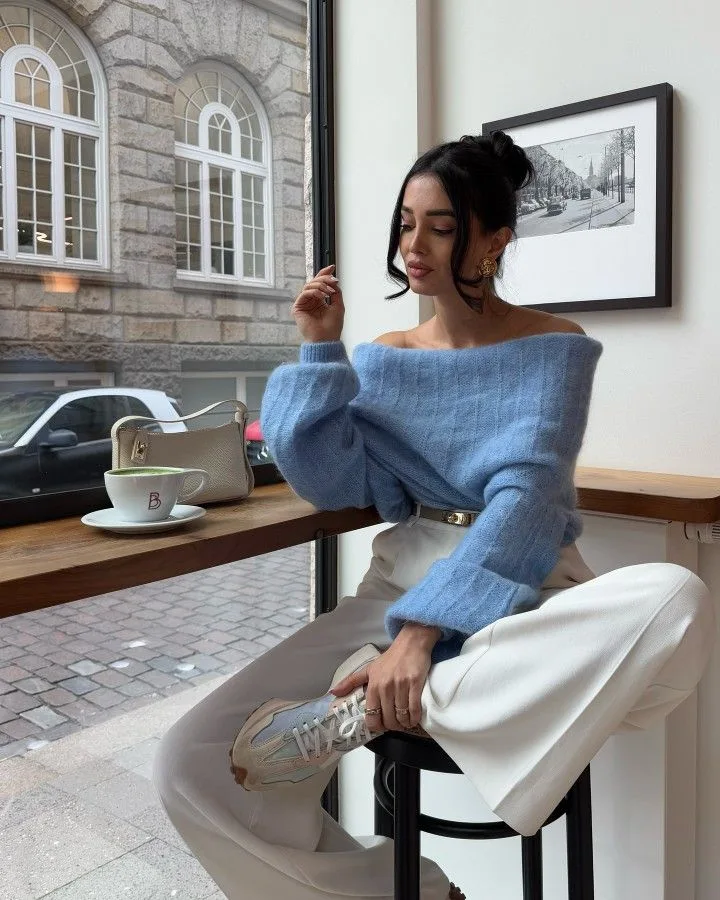 A soft powder blue off-shoulder knit sweater creates a romantic, relaxed silhouette with a touch of elegance. Paired with high-waisted cream wide-leg trousers and neutral sneakers, the look feels polished yet cozy—an effortlessly chic option for a laid-back Easter coffee date.
