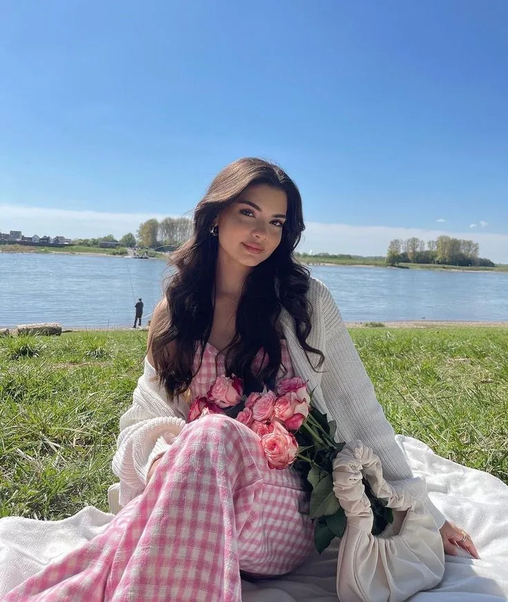 A soft pink gingham dress creates a sweet, feminine silhouette with a fresh spring feel. Layered with a relaxed cream cardigan and paired with delicate accessories, the look feels romantic and effortless—perfect for a sunny Easter picnic by the water.