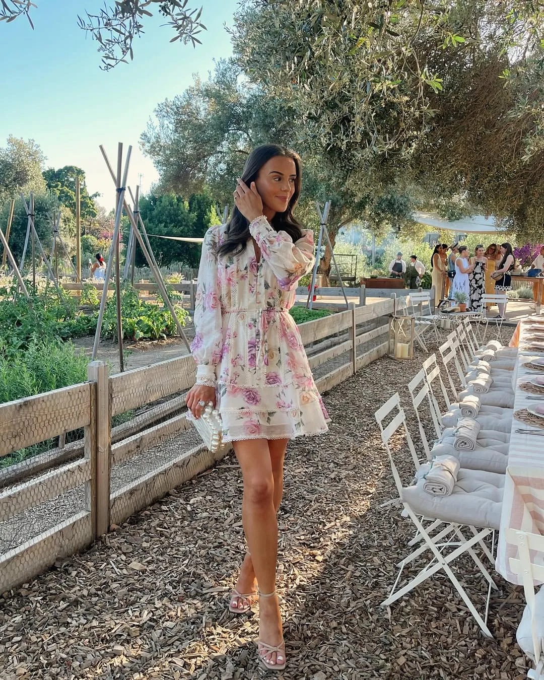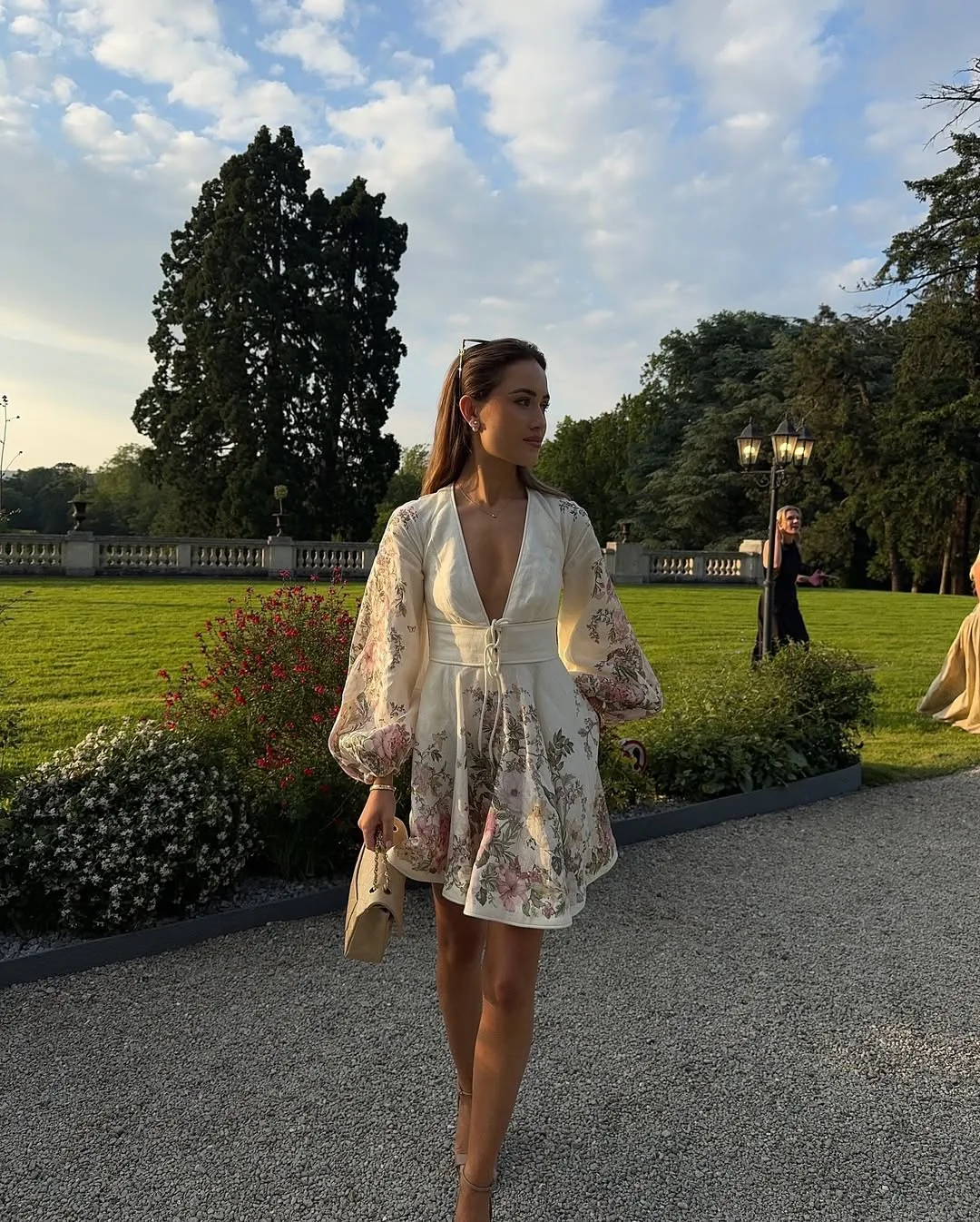 A cream mini dress adorned with soft floral prints features a plunging neckline and a cinched waist for a flattering, feminine shape. Sheer long sleeves add airy elegance, creating a romantic and polished Easter look with graceful movement.