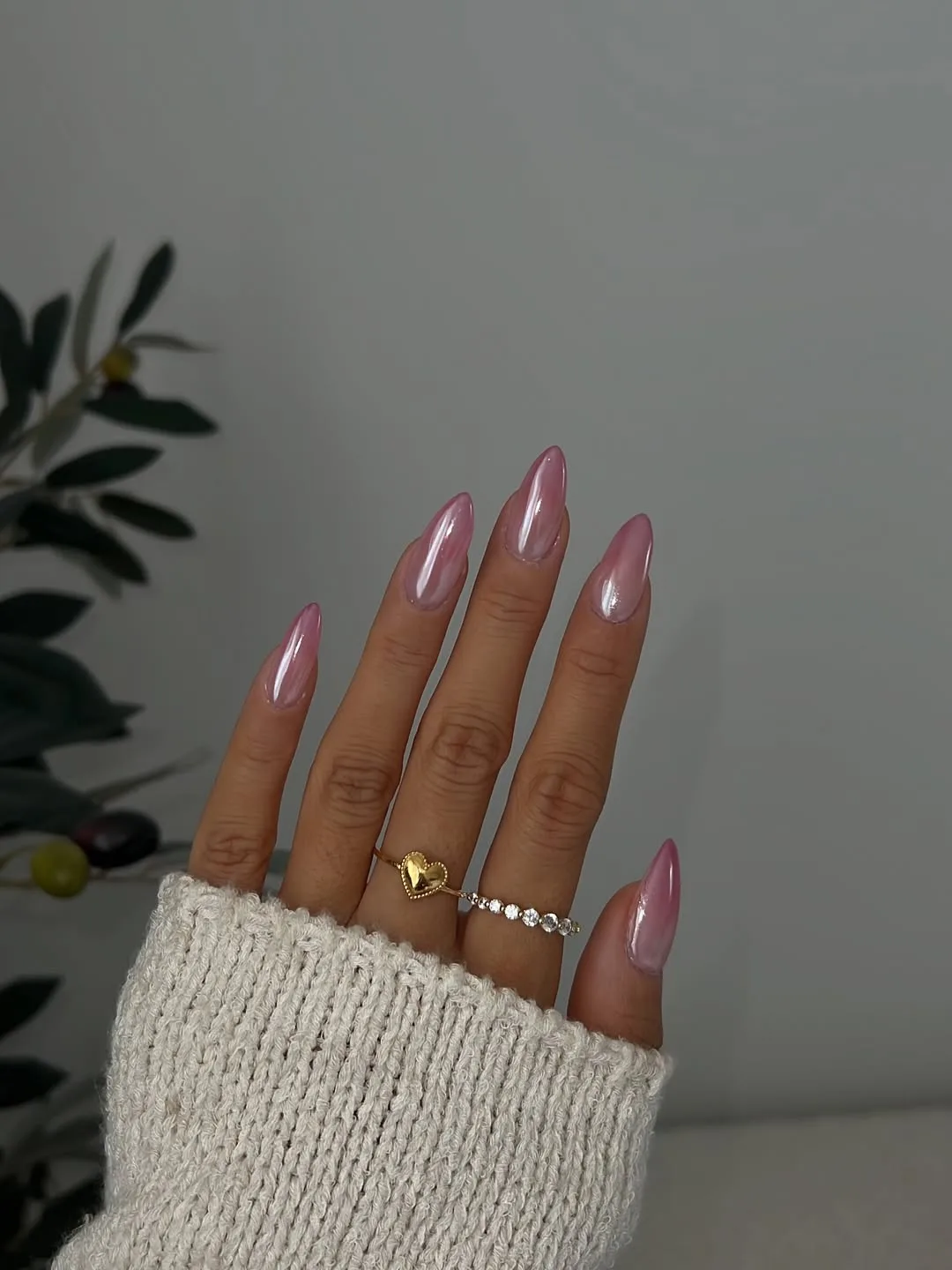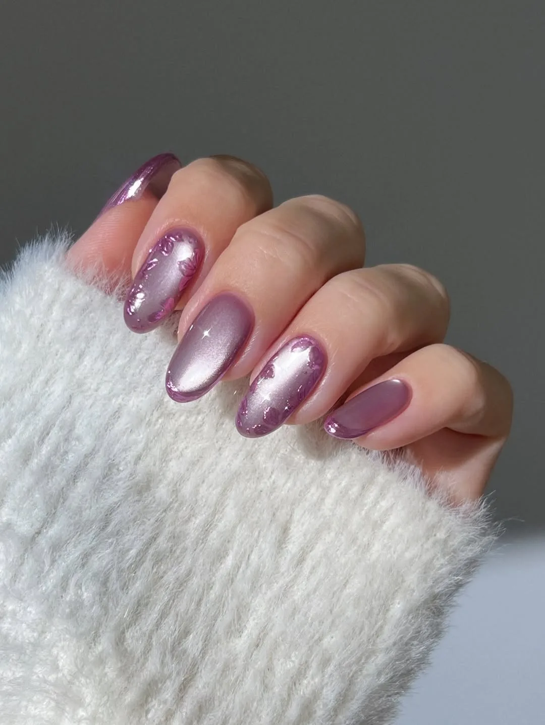 This romantic April design features an elegant almond silhouette with a sheer dusty rose base, elevated by a bold twist of high-shine pearlescent chrome for a sophisticated, “lit-from-within” finish that glows with every movement.