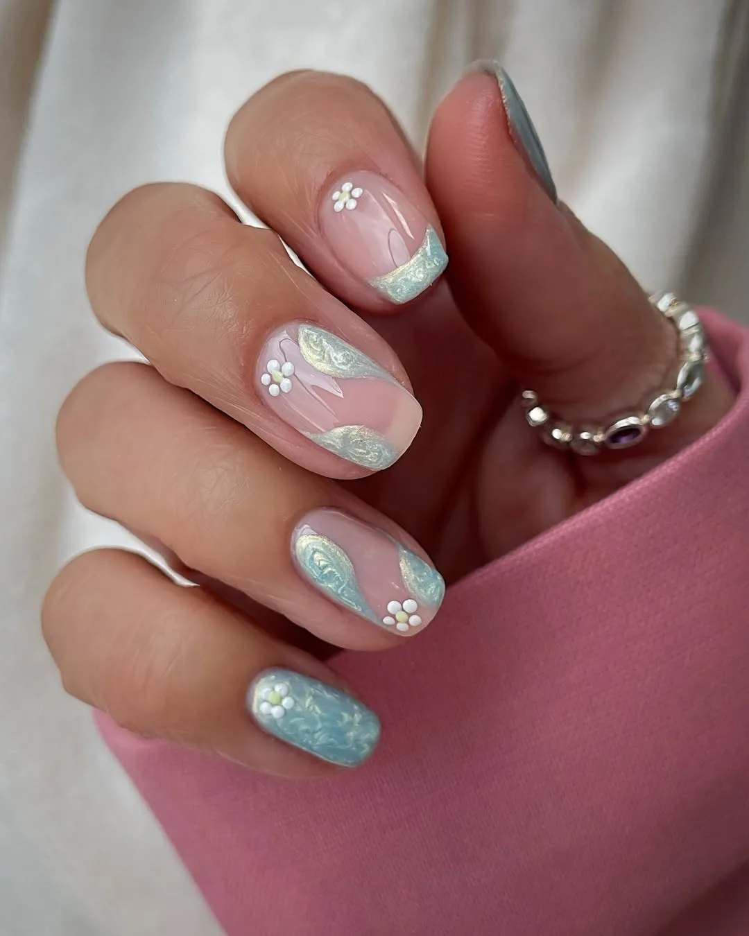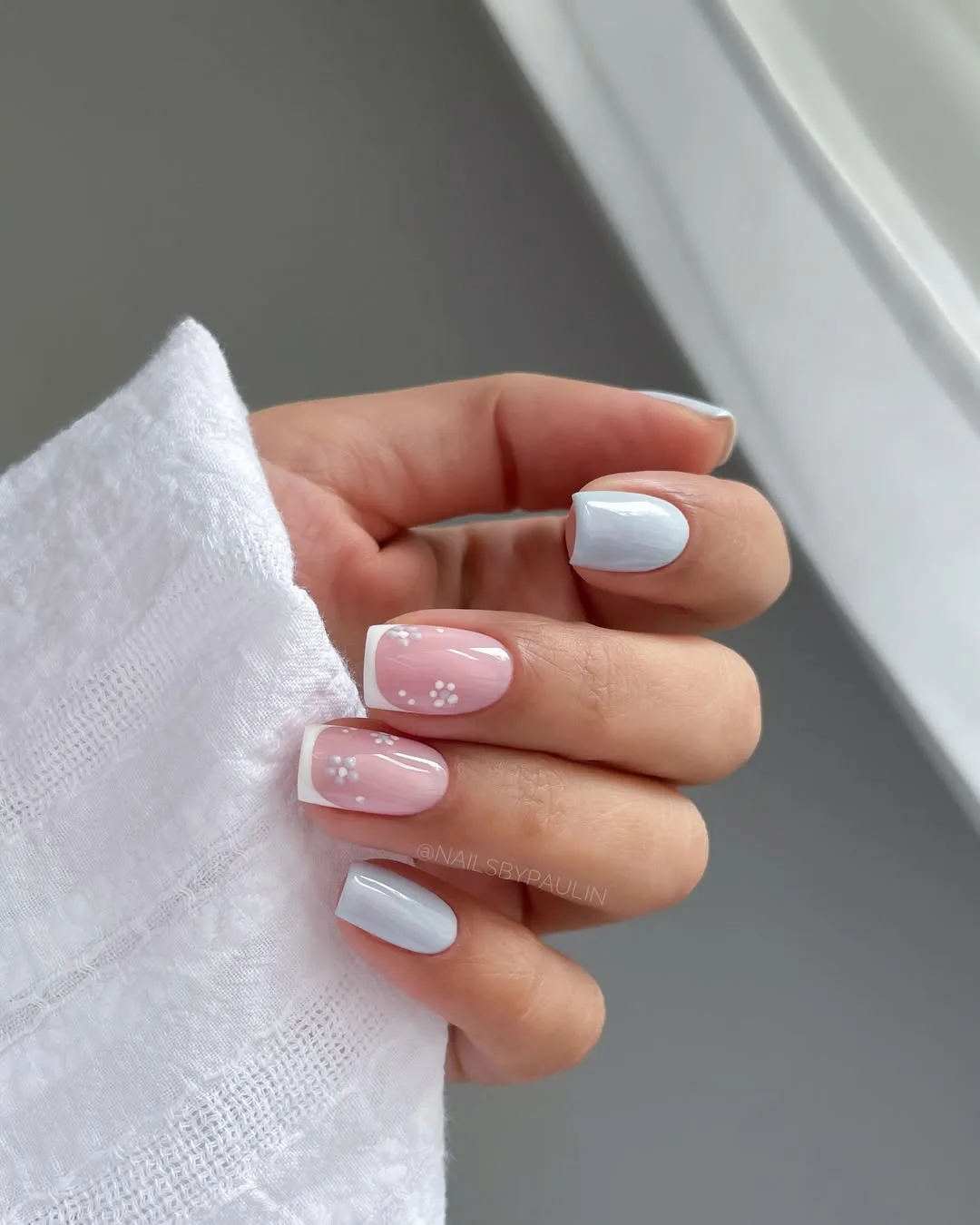 This romantic April design pairs soft sky-blue solid nails with a sheer pink base on a clean square shape, elevated by crisp white French tips and dainty hand-painted daisies for a fresh, sophisticated spring aesthetic.