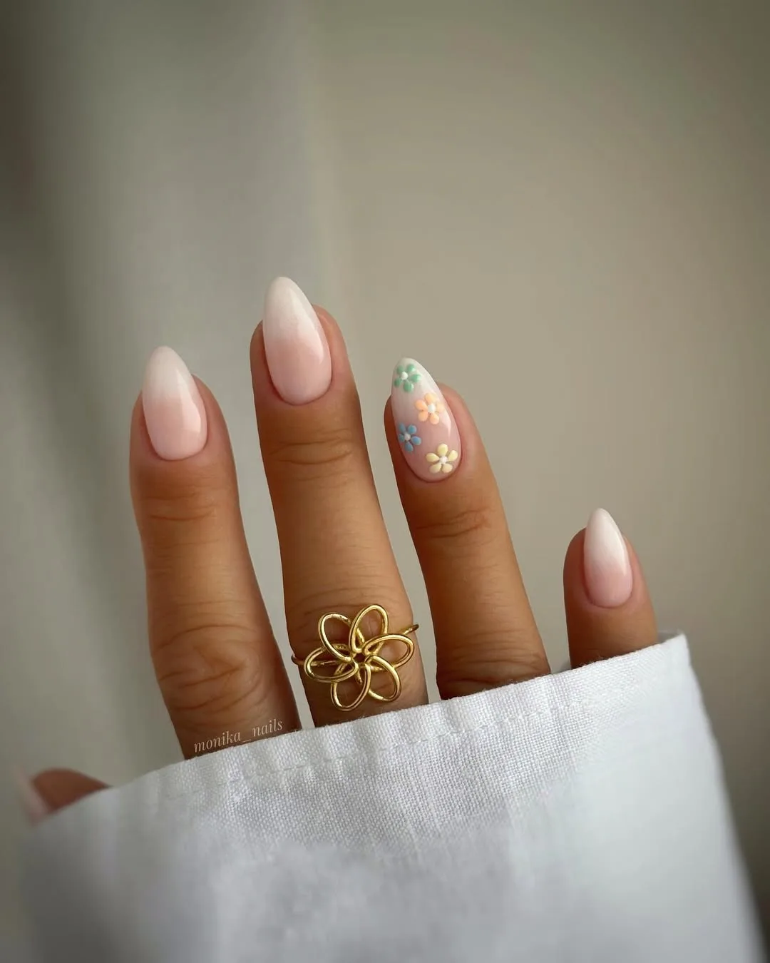 This romantic April design features a soft blush-pink base on an elegant almond shape, elevated by a seamless milky white ombré finish and accented by a single finger showcasing dainty, hand-painted 3D pastel wildflowers for a fresh, garden-inspired twist.