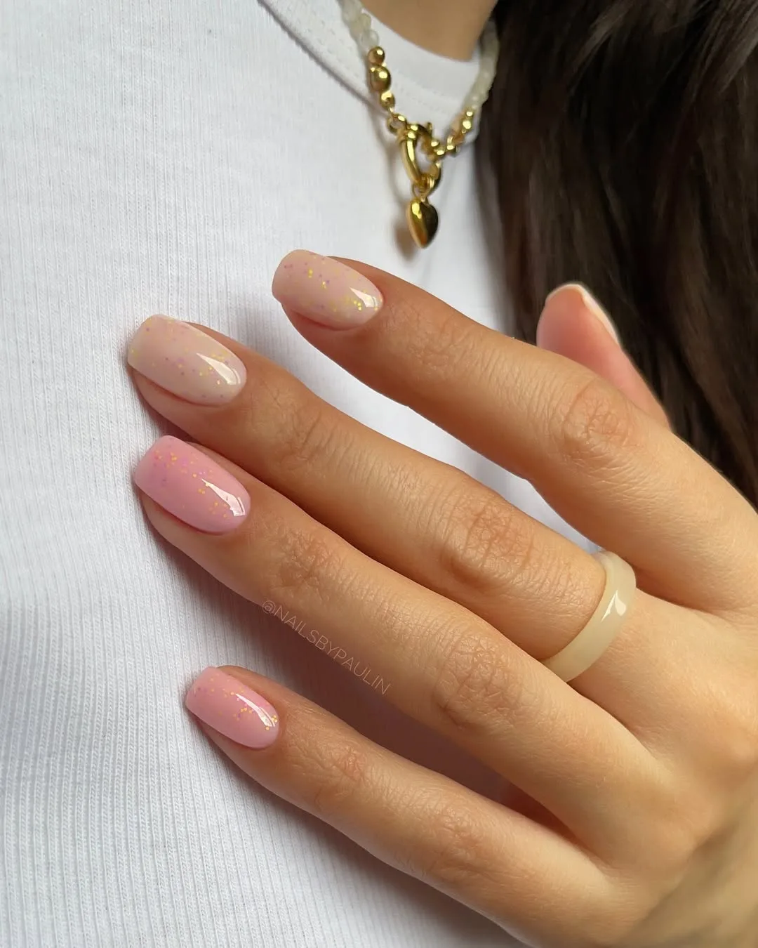 This chic April design features a soft, romantic gradient of sheer peach and rose pink on a clean square shape, elevated by a bold twist of scattered iridescent gold flakes for a sophisticated shimmer that catches the light.