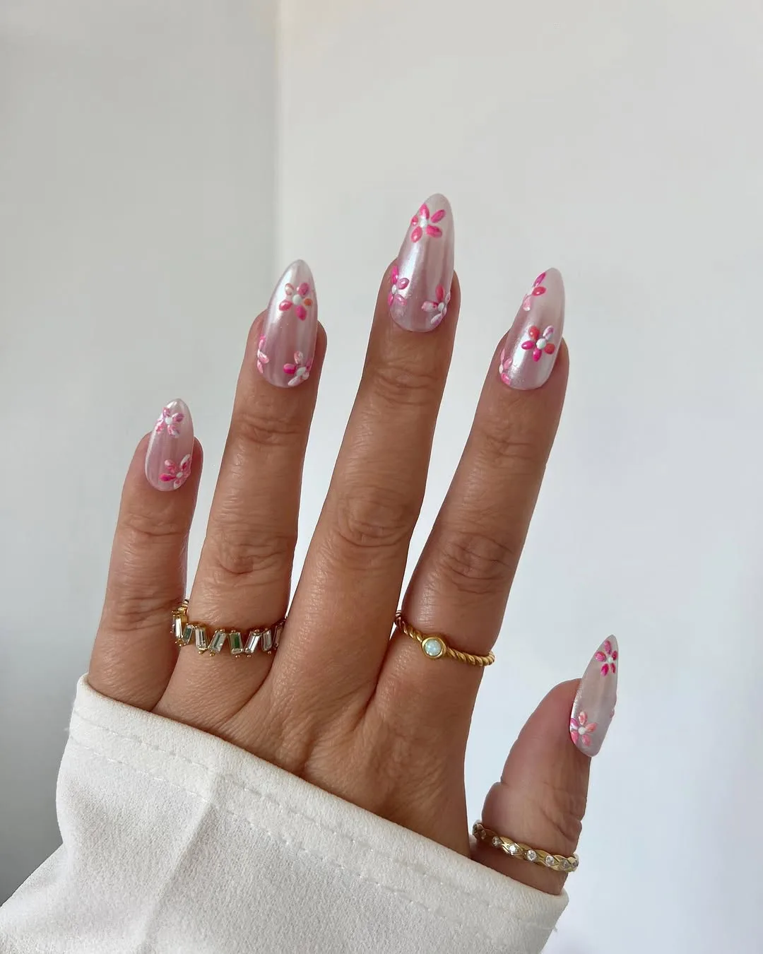 This romantic April design features an elegant almond shape with a high-shine iridescent chrome base, elevated by a bold twist of hand-painted magenta and white 3D floral accents with delicate pearl centers for a sophisticated, garden-inspired glow.