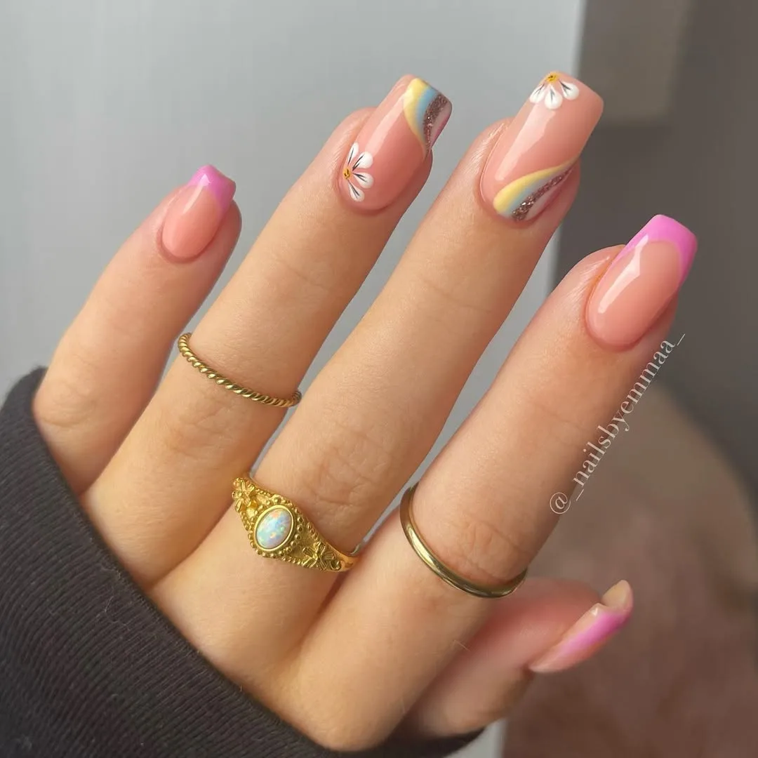This chic April design uses a soft nude base on a medium square shape, featuring vibrant pink French tips accented by delicate hand-painted daisies and swirling pastel waves with a hint of gold glitter.
