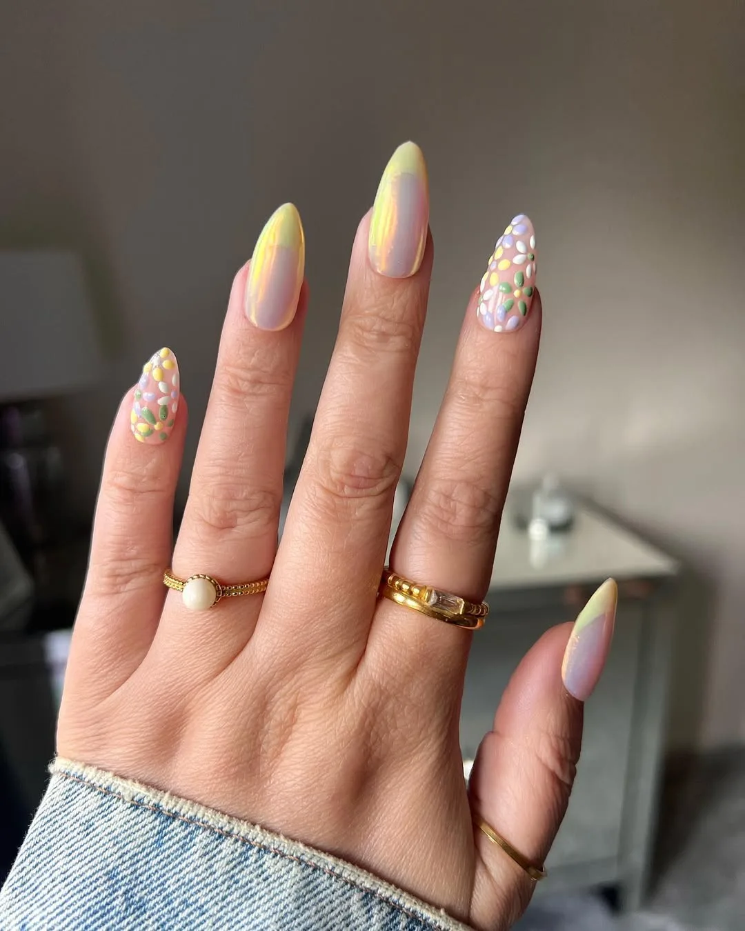 This romantic April design features an elegant almond shape with a high-shine iridescent chrome base, elevated by a bold twist of butter-yellow French tips and a statement accent nail showcasing hand-painted pastel wildflowers for a sophisticated spring glow.