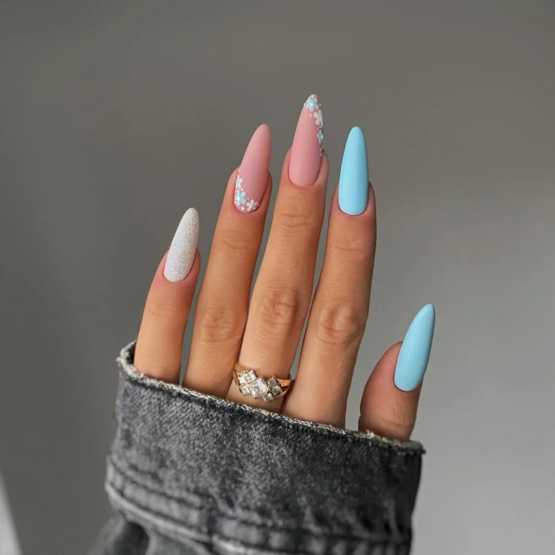 This romantic April design features an elegant stiletto shape with a velvet-matte finish, pairing soft rose and sky-blue solid nails with a bold twist of a sugar-glittered accent and hand-painted floral borders.