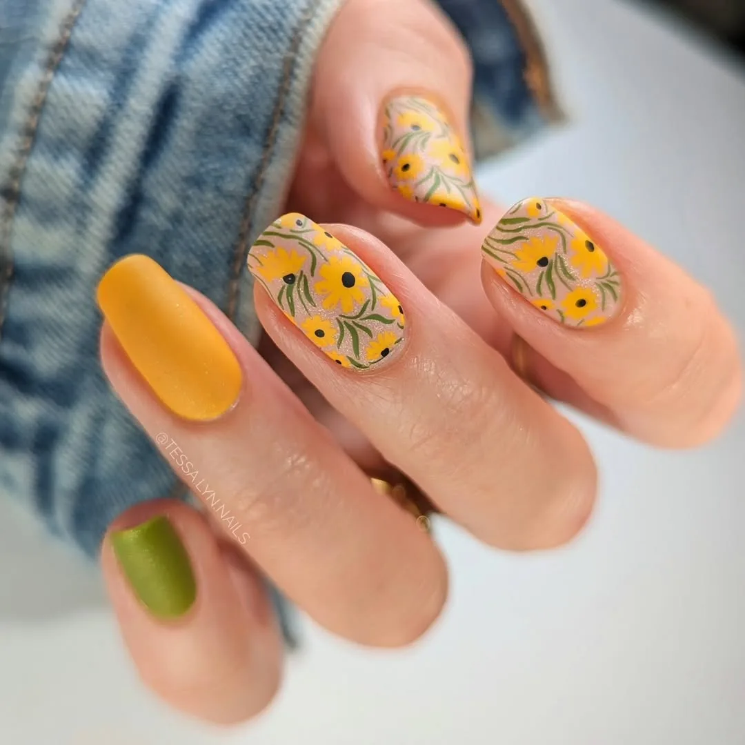 This romantic April design features a velvet-matte finish on a clean square shape, pairing solid mustard yellow and sage green nails with a bold twist of hand-painted sunflowers and intricate leaf vines for a sophisticated, earth-toned garden aesthetic.