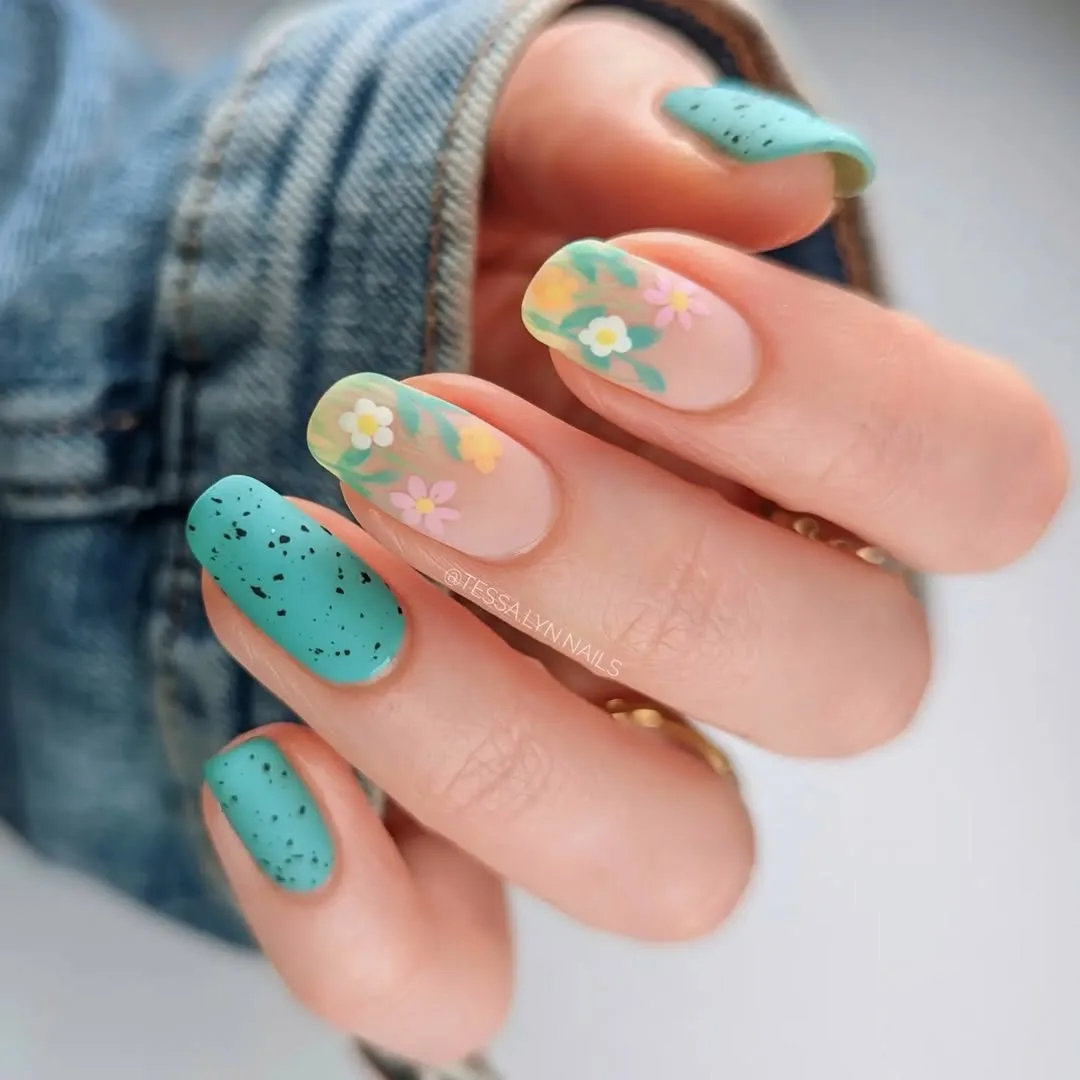 This chic April design features a velvet-matte finish on a clean square shape, pairing speckled turquoise “robin’s egg” nails with a bold twist of hand-painted pastel wildflowers over a sheer nude base.