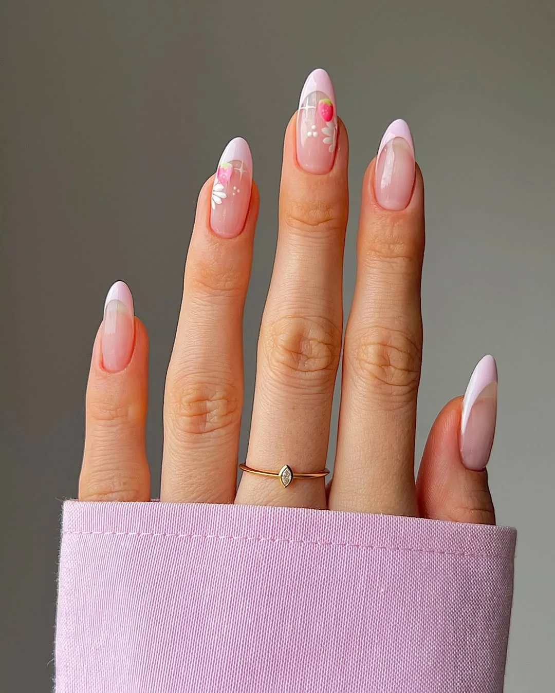 This romantic April design features an elongated almond shape with a sheer nude-pink base, elevated by a bold twist of soft pink French tips, hand-painted white daisies, and delicate gold sparkles for a sophisticated spring aesthetic.