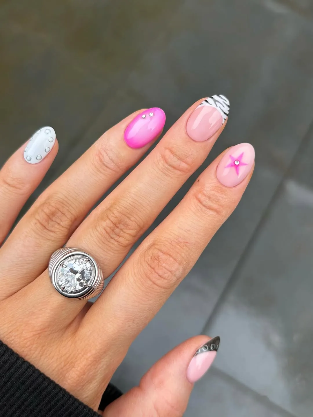 This chic April design features an elegant oval shape with a romantic sheer pink base, elevated by a bold mix of magenta aura glows, zebra-print French tips, and hand-painted star accents with crystal centers for a playful, high-fashion finish.
