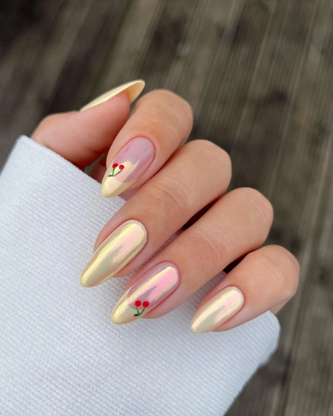 This romantic April design features an elegant almond shape with a high-shine iridescent yellow-gold chrome base, elevated by a bold twist of hand-painted cherry accents for a sophisticated, “fruit-girl” aesthetic.
