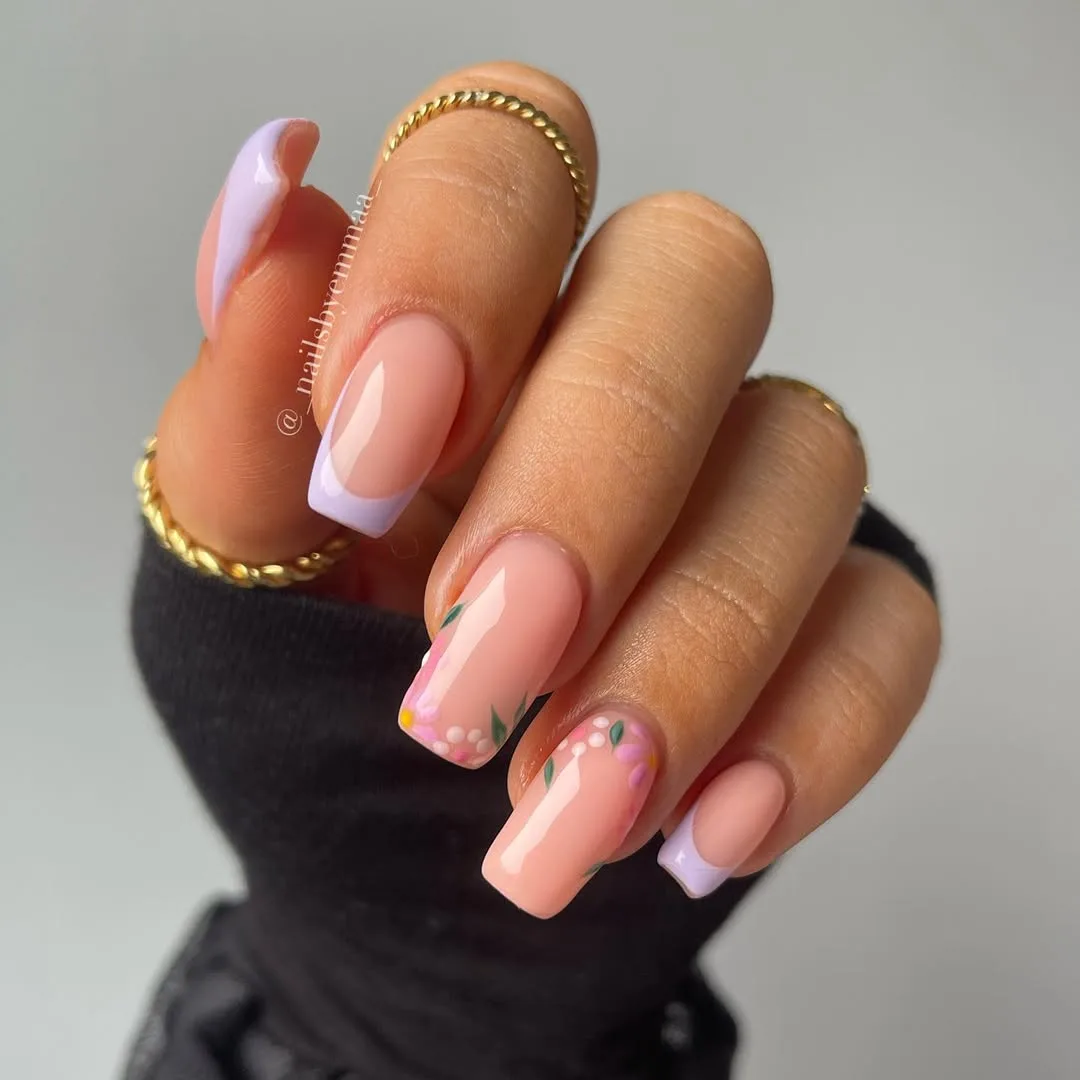 This romantic April manicure features a sheer nude base on an elegant square shape, pairing soft lavender French tips with dainty hand-painted wildflowers and botanical accents for a fresh, sophisticated spring look.